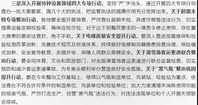 明年,監(jiān)管部門將繼續(xù)貫徹“全國城鎮(zhèn)安全排查整治動員部署”,并深入開展“超期未檢專項整治行動、電梯質(zhì)量安全提升行動、滑雪場客運索道聯(lián)合整治行動和黑氣瓶整治鞏固提升行動”四大專項行動。因此電梯行業(yè)仍是特種設(shè)備監(jiān)管重點領(lǐng)域。